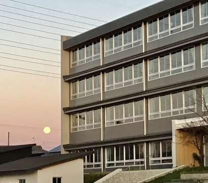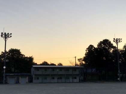 朝の運動場からの校舎と皆既月食を終えた月の様子です。一大事を終えたそして悠然と構えた月が校舎に映えていました。