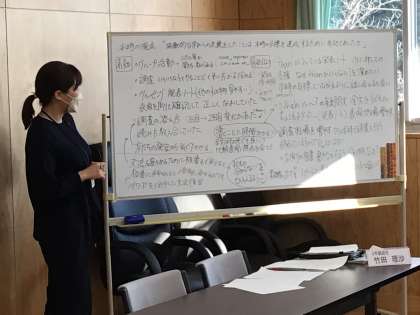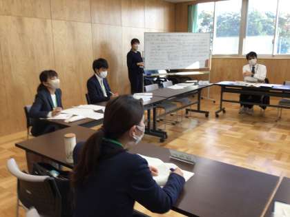 授業後、生徒が帰ったのちに、研究授業の反省を行いました。初任者の先生方は、自分の置かれた状況をしっかりと把握し、各学校での実践を出して、話し合いをしました。