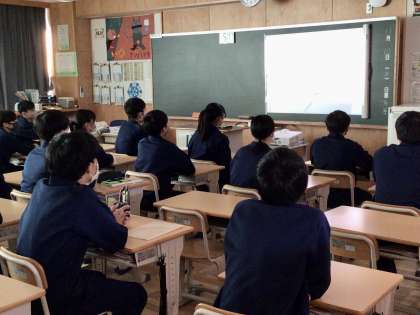 3年2組の朝の会の様子です。 生徒が、自作のVTRを皆に披露しているようでした。