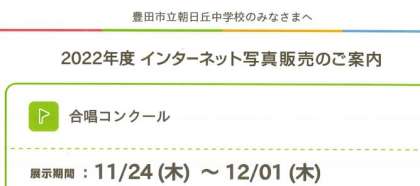 合唱コンクールの写真ネット販売についての案内を本日配付しました。掲載(注文)期間は11月24日(木)〜12月1日(木)となっています。なお、ホームページにも同じ案内を掲載いたします。(ユーザー名とパスワードはいつものものです。午後4時30分に改めてメールで配信します)