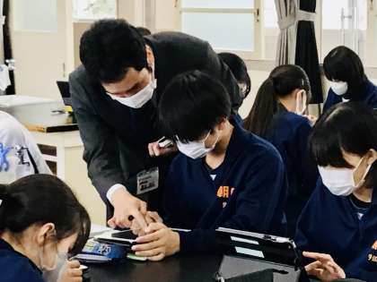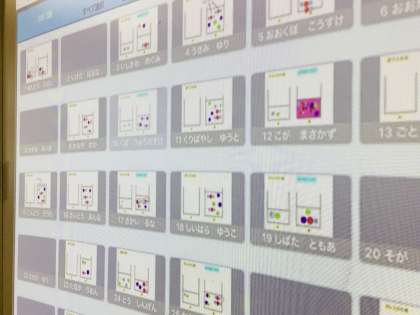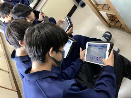 タブレットを使い、協働的な話し合い活動を進めます。 発表ノートを使っています。