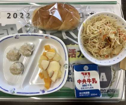 今日の給食は、 ⭐️炒めビーフン ⭐️りんごポンチ ⭐️米粉パン ⭐️海老焼売 ⭐️牛乳でした。