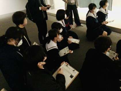 12/13(火)25C豊田市美術館での学習8 公開日 2022/12/13 更新日 2022/12/13 各学年から 浮かんでいるものが、雲のように見えること、地面に生えている木の表現、川のようなものが見えること、後ろの尖っているものが、何に見えるのかについて学習しました。 他の6クラスも明後日から来週にかけて、学習を進めます。 朝中フォーマルウエアー(制服等)を忘れずに 2年