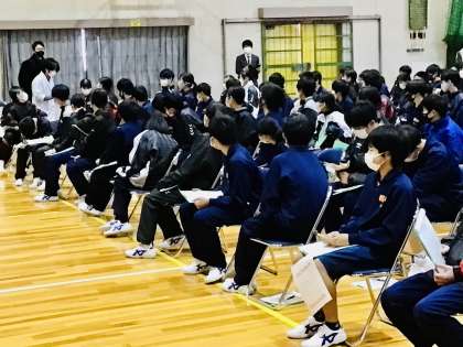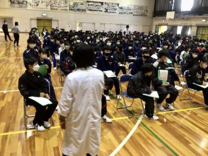 12/14(水)1年学校保健大会6 公開日 2022/12/14 更新日 2022/12/14 学校の特色ある活動 本日は、食育について楽しく学ぶことができました。食は、成長期の生徒たちにとって、とても大切な学習です。毎朝、きちんと朝食を食べることからしっかりと行うことを続けていきましょうね。 1年 特色ある活動