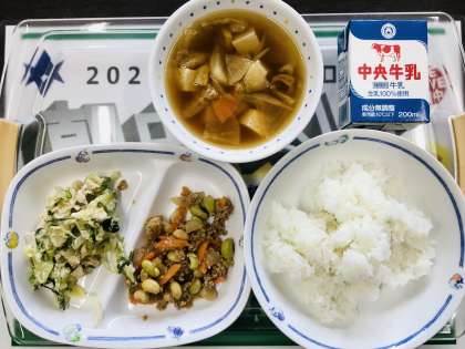 本日の給食は、 ⭐️京菜のサラダ ⭐️大豆のピリ辛炒め ⭐️けんちん汁 ⭐️ご飯と牛乳です。