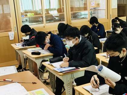 12/21(水)2時間目 31C数学 公開日 2022/12/21 更新日 2022/12/21 各学年から 2時間目の3年1組の授業です。 円周角の復習及び三平方の定理の簡単な比を覚え直しました。 その後、数学の友を行いました。 3年
