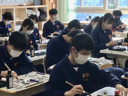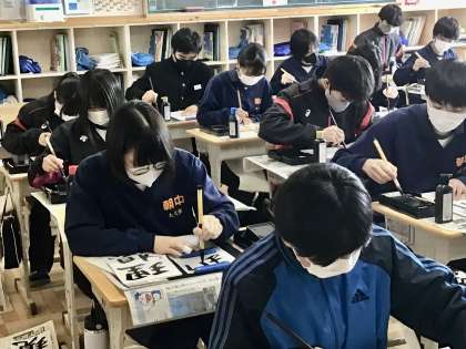 3年8組の書き初め大会の様子です。 真剣な姿をご覧下さい。
