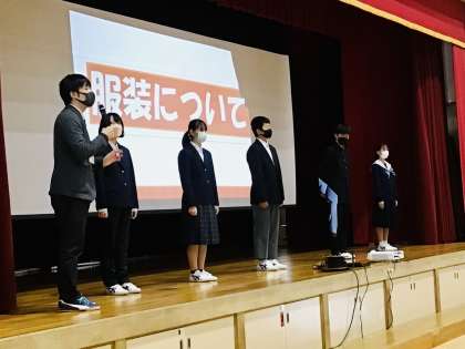 その後、本校の生活についての話をいたしました。スクールユニフォームについては、従来の制服に加えてブレザー型のフォーマルウェアを採用していることを現在の一年生に登場してもらい、紹介をいたしました。