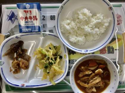 今日の給食は、 ⭐️小松菜の和物 ✳️レバーと蒟蒻の甘辛煮 ⭐️ご飯 ✳️豚汁です。