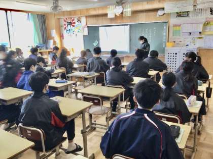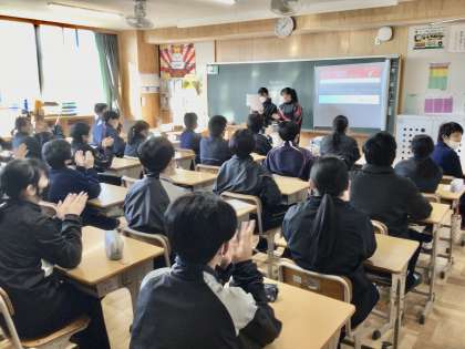 学級活動の時間に1年生教室で3年生が何かを説明していました。