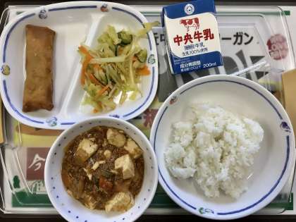 今日の給食は、 ✳️中華あえ ⭐️春巻き ✳️麻婆豆腐 ⭐️ご飯と牛乳でした。