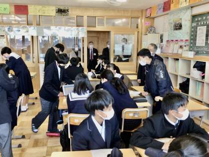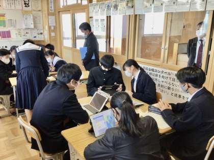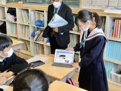 2/27(月)11C タブレット端末を使って 公開日 2023/02/27 更新日 2023/02/28 各学年から 1年生は、1時間目にタブレット端末を使った授業を展開していました。 豊田市のICT活用・整備推進事業の視察で、豊田市教育委員会の方々が、来校され、見学をされました。1年1組では、タブレット端末を使って、班発表を行う姿が見られました。 1年