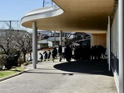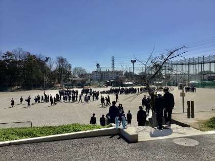 全校で、人文字を作るために昇降口から、運動場に全員出ている様子です。