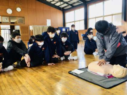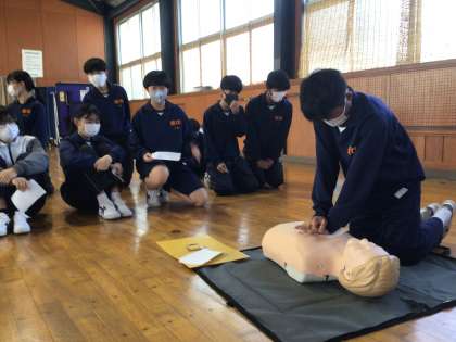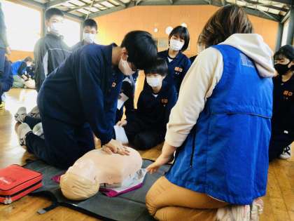 3/22(水)21c22C応急手当講習会2 公開日 2023/03/22 更新日 2023/03/22 各学年から 実際にAEDを一人一人操作しました。リズムに合わせて、胸骨圧迫の練習をしました。 2年