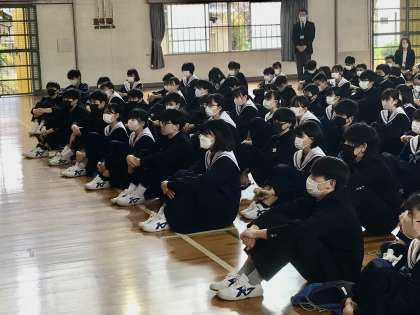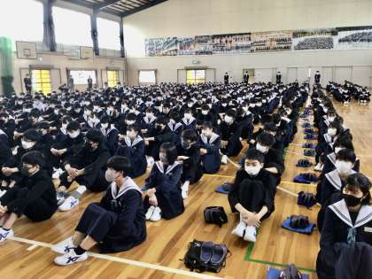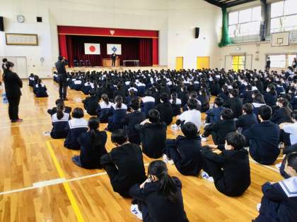 最初に朝日丘大賞、朝日丘賞の表彰を行い、その後生徒代表の意見発表を行いました。
