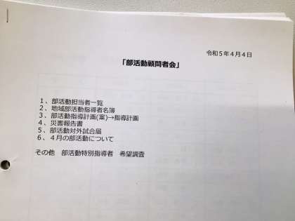 4/4(火)部活動顧問者会を行いました2 公開日 2023/04/04 更新日 2023/04/04 特別活動 豊田市部活動ガイドラインや部活動の考え方、経営の仕方等について皆で情報交換をしました。 部活動
