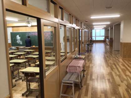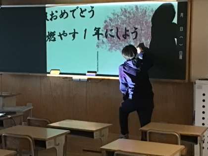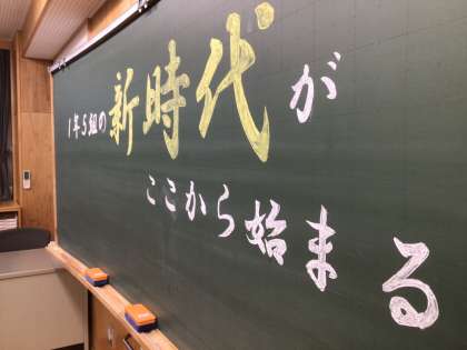 新1年生の教室フロアの様子です。黒板メッセージ