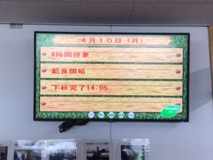 昇降口前のモニターです。毎朝、今日の1日を紹介しています。