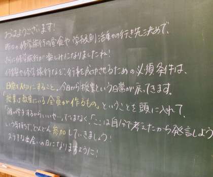 今日の黒板メッセージと生徒の朝の様子です。