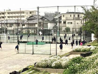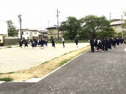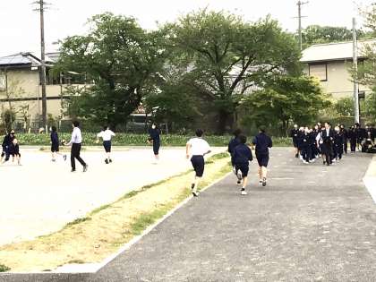 ソフトテニス部、陸上部、バレー部です。1年生の生徒が練習の様子を見ています。