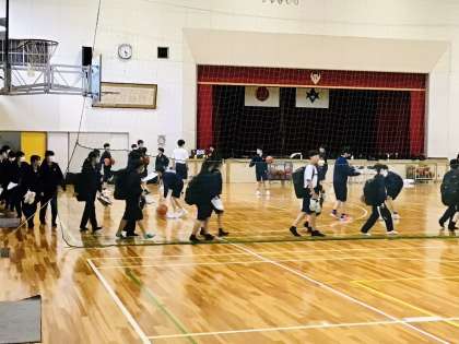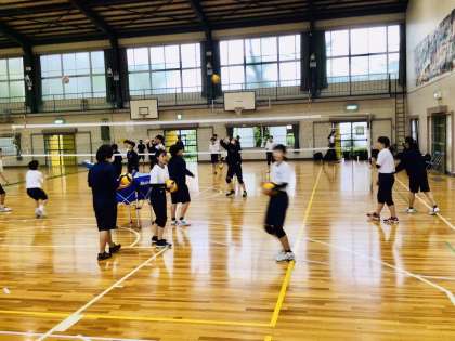 体育館内のバレー部、バスケットボール部です。 1年生の生徒たちが、見学を続けています。