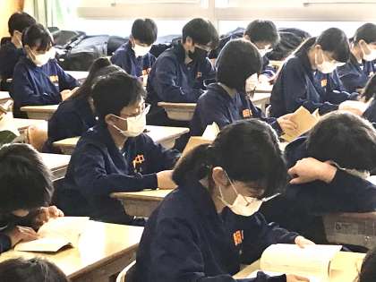 1年5組です。黒板メッセージが黒板いっぱいに書かれています。