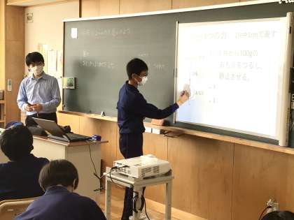力の釣り合いの授業です。自分の考えを説明している場面です。