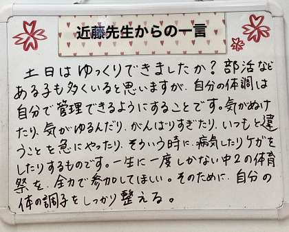 4/24(月)今日の学年メッセージ 公開日 2023/04/24 更新日 2023/04/24 各学年から 本日の各学年からのメッセージです。 これを見て、築いて動くことができる生徒がたくさん増えますね。楽しみです。