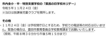 県民の日ホリデーについて【お知らせ】 公開日 2023/05/12 更新日 2023/05/12 お知らせ 以前、きずなネットでお知らせいたしましたが、県民の日ホリデーについての連絡が、豊田市教育委員会より入りました。 ご覧ください。 ↓↓↓↓ ☆☆県民の日ホリデー☆☆