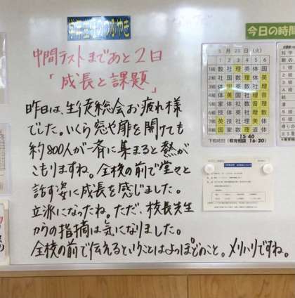 5/23(火)3年学年黒板より 公開日 2023/05/23 更新日 2023/05/23 校長室から 全校で集まるということは、本当に久しぶりで、慣れない生徒の椅子入れも重なって、昨日は、ややざわついた感がでてしまいました。しかし、朝中生の皆さんは、きっと次に入場する機会があれば、規律ある行動がしっかりとできる人たちであると信じています。 生徒総会もよく頑張りました。 校長