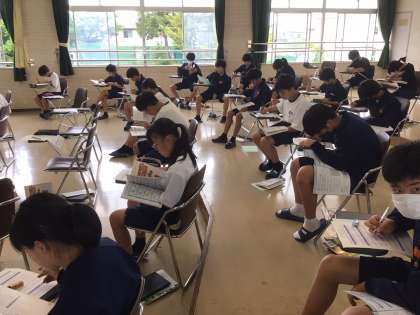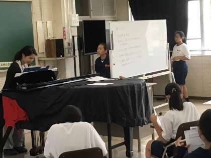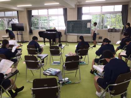 5時間目、音楽室では、歌のテストを行っていました。3年5組と1年4組です。