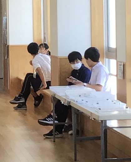 朝中では、テスト週間と並行して、教育相談習慣をおこなっています。担任の先生を中心にクラスの全生徒と話をして、日ごろ生徒たちが考えていること、迷っていることなどの相談活動を行っています。写真は、3年生、1年生の様子です。