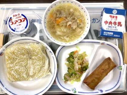 5/25(木)今日の給食!! 公開日 2023/05/25 更新日 2023/05/25 校長室から 今日の給食は、 ⭐️中華あえ ⭐️春巻き ⭐️塩ラーメン ⭐️ヨーグルト ⭐️牛乳でした。今日も美味しくいただけましたね。