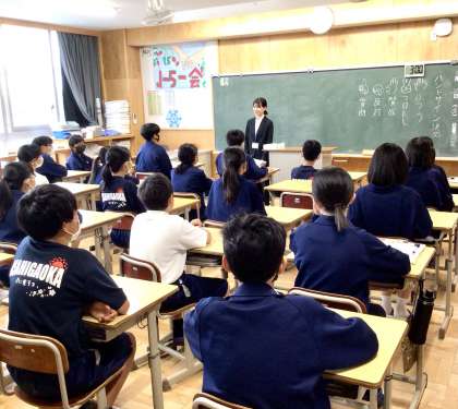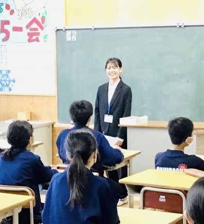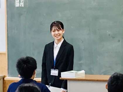 1年5組の教室です。生徒の皆さんに挨拶をする教育実習生です。