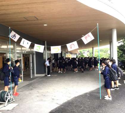 今では、朝中の生徒たちは、あいさつの門を通ります。