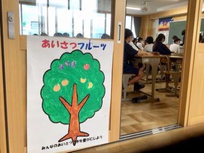 1年7組のあいさつのフルーツが少し、彩り良くなってきました。