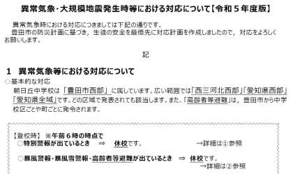 今年度版の異常気象・大規模地震発生時等における対応についてを作成いたしました。いま一度ご確認ください。プリントとしては、お子様を通じて、すでに配付をしております。