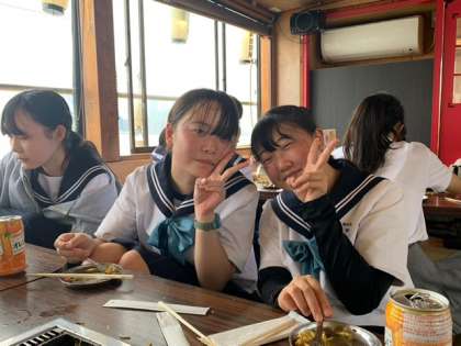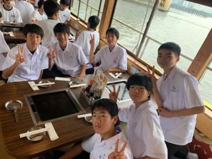 屋形船の中です。もんじゃ焼きを食べます。