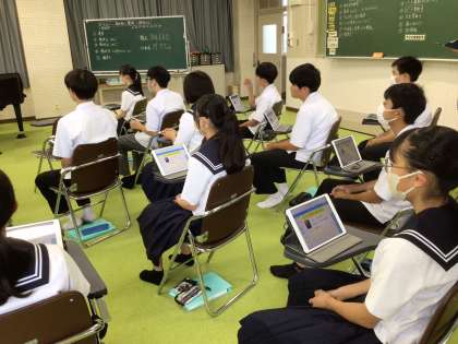 鑑賞の分野の授業です。曲の構成している素材を見つけ、グループで話し合いをしました。