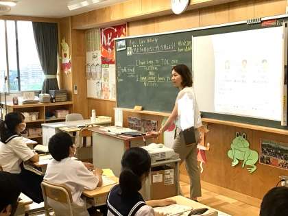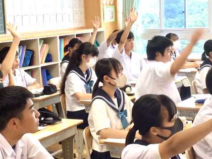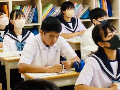 3年生の教室です。英語の授業を行っています。外国人中学生にぴったりのおもてなしプランを考えました。