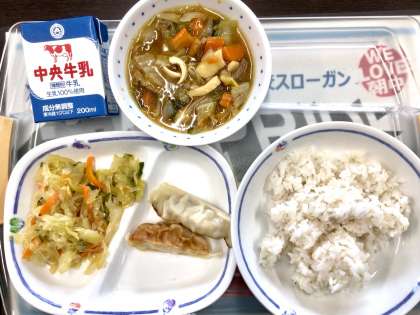 今日の給食は、 バンサンスー 餃子 中華飯でした。 美味しくいただきましたね。