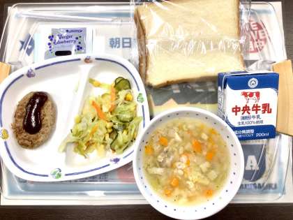 今日の給食はハンバーグと大麦と野菜のスープでした。スライスパンにジャムをつけて食べましたね。