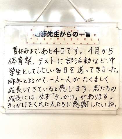 7/14(金)成長を見せる2年生 公開日 2023/07/14 更新日 2023/07/14 各学年から 朝中生は、高学年になるほど成長が見られます。 きちんと目標を立てて、その目標に向かっていくことのできる生徒が多いからだと思います。 1年生より、2年生そして、2年生より3年生が人として立派になっていく、そんな学校が、 朝中です。