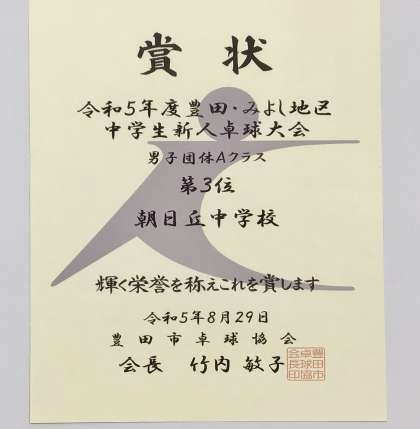 8/30(水)令和5年度豊田・みよし地区中学生新人卓球大会結果 公開日 2023/08/30 更新日 2023/08/30 お知らせ 昨日、スカイホール豊田において行われた、令和5年度豊田・みよし地区中学生新人卓球大会において、本校卓球部が団体第3位を獲得しました。 応援ありがとうございました。 1年 2年 部活動