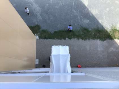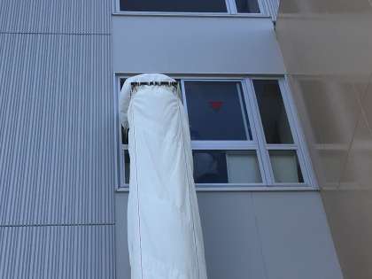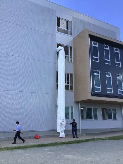 垂直救助袋を使った避難練習です。垂直ですが、内部が螺旋状態になっておりて来れるようになっています。