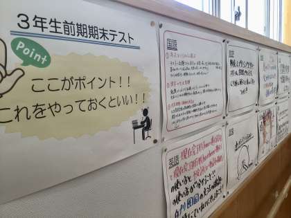 9/5(火)3年生の掲示板より 公開日 2023/09/05 更新日 2023/09/05 各学年から 3年生の掲示板には、それに加えて、明日からのテストのポイントが記されていました。明日から頑張ってくださいね。 3年