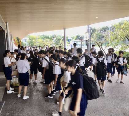 今日もたくさんの朝のあいさつボランティアの生徒たちで溢れかえっています。