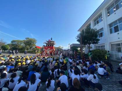 10/14(土)昨日の童子山小 山車の見学 公開日 2023/10/14 更新日 2023/10/14 校長室から 昨日、童子山小学校にて、「挙母祭りを学ぶ会」がありました。これは今年度から始まった行事で、子どもたちの地域への愛着を深めることを目的に行われたそうです。6年生児童は、愛知県の重要文化財である山車を蔵から学校まで引いたそうです。 旧南町の方々を中心に多くの地域の方々にご協力があってのことだと思います。素晴らしい会を遠くで見させていただきました。