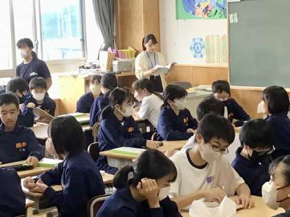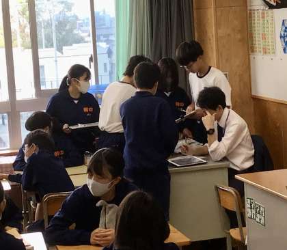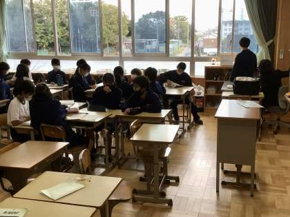 先生の机の周りにたくさんの生徒たちがいますね。1年3組です。