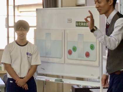 塩化銅水溶液における化学変化をイオンのモデルと関連付けながら、説明をしています。